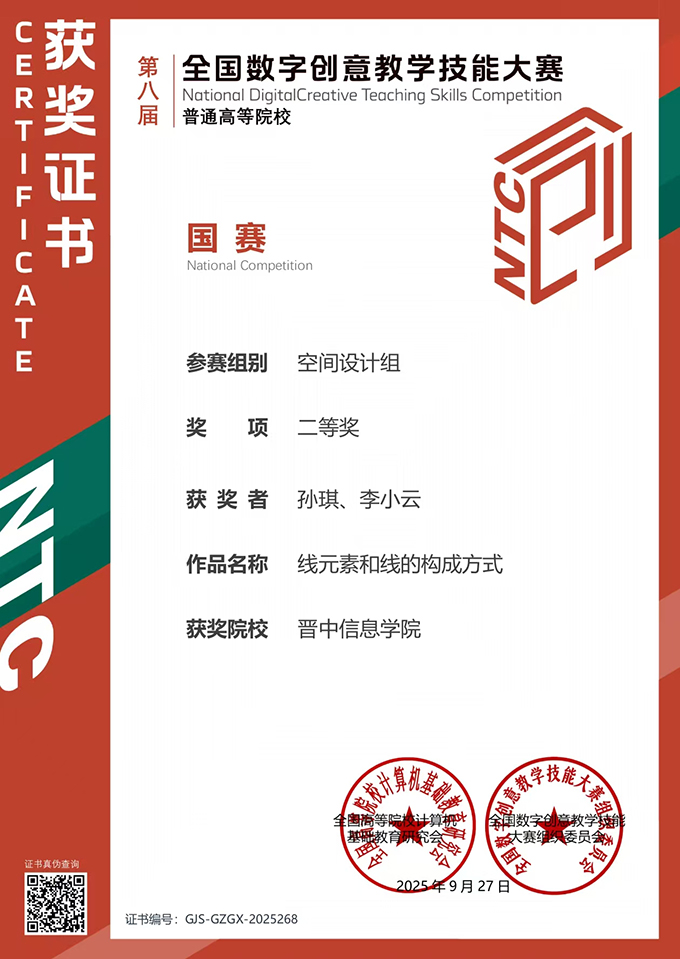 9月28日,由全国高等院校计算机基础教育研究会、全国数字创意教学技能大赛组织委员会联合主办,全国高等院校计算机基础教育研究会数字创意专业委员会与长沙理工大学共同承办的第八届全国数字创意教学技能大赛国赛终评会及颁奖典礼圆满落幕。我校0638太阳集团官网孙琪副院长、李小云老师,凭借紧扣数智化教学趋势的创新研究与扎实教学功底,在空间设计组激烈角逐中斩获国家级二等奖,为学院教学成果再添亮眼注脚。