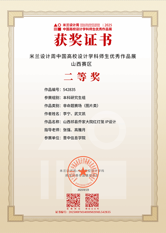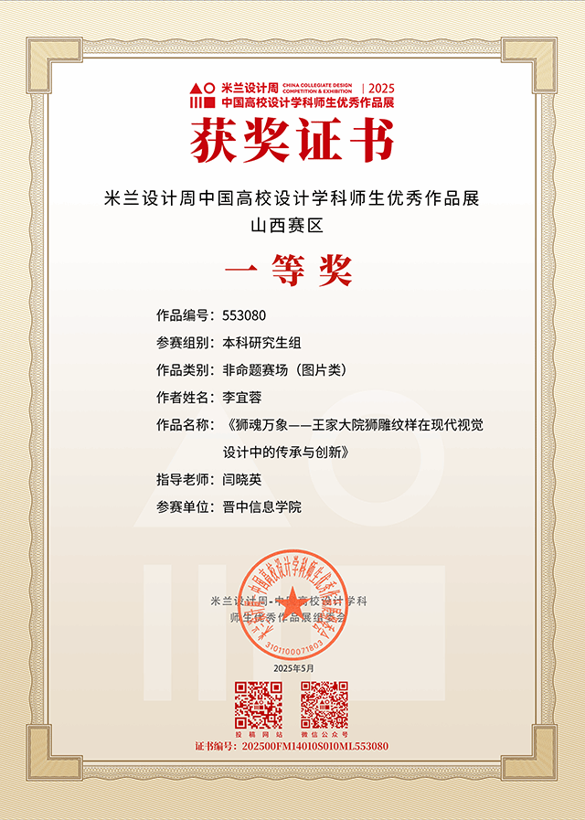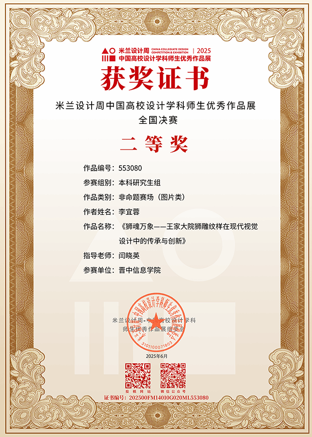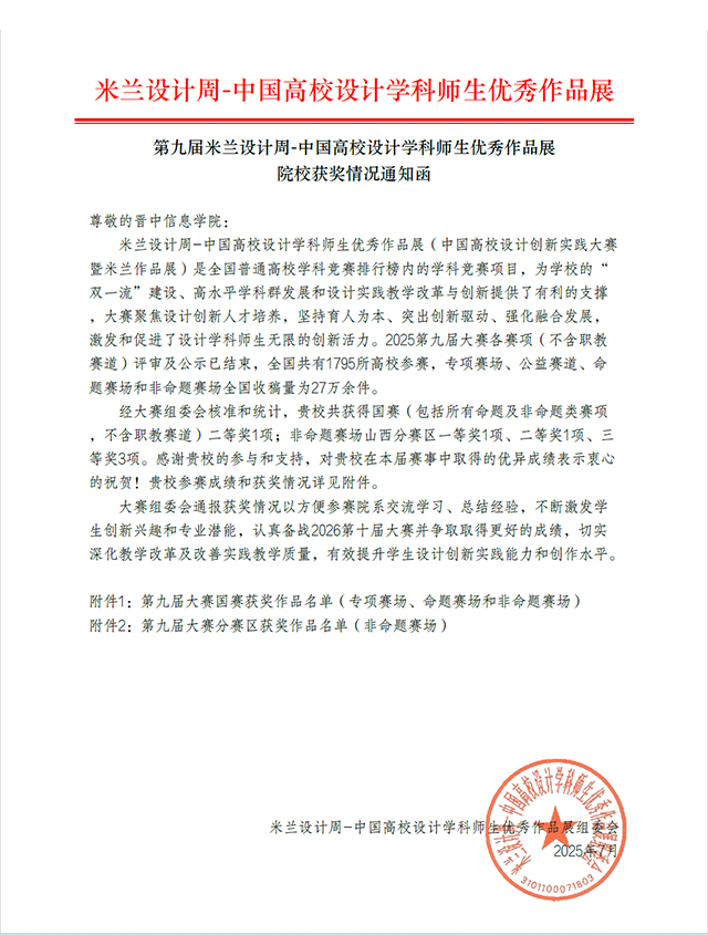 近日,2025年第九届米兰设计周——中国高校设计学科师生优秀作品展评选活动及颁奖仪式落下帷幕。太阳集团0638师生表现卓越,成功斩获1项国家级二等奖和6项省级奖。其中在山西省赛评选中,我校0638太阳集团官网师生共计获得1项省一等奖,2项省二等奖,3项省三等奖,在全国高校中成绩优异,全省同类院校中崭露头角,再次为学校增添光彩和荣誉。米兰设计周作为全球设计领域的年度盛会,其中国高校设计学科师生优秀作品评选活动已连续多年入选全国高校学科竞赛排行榜,影响力深远。此次活动吸引了来自全国1759所高校的27万余件作品参赛,竞争之激烈不言而喻。